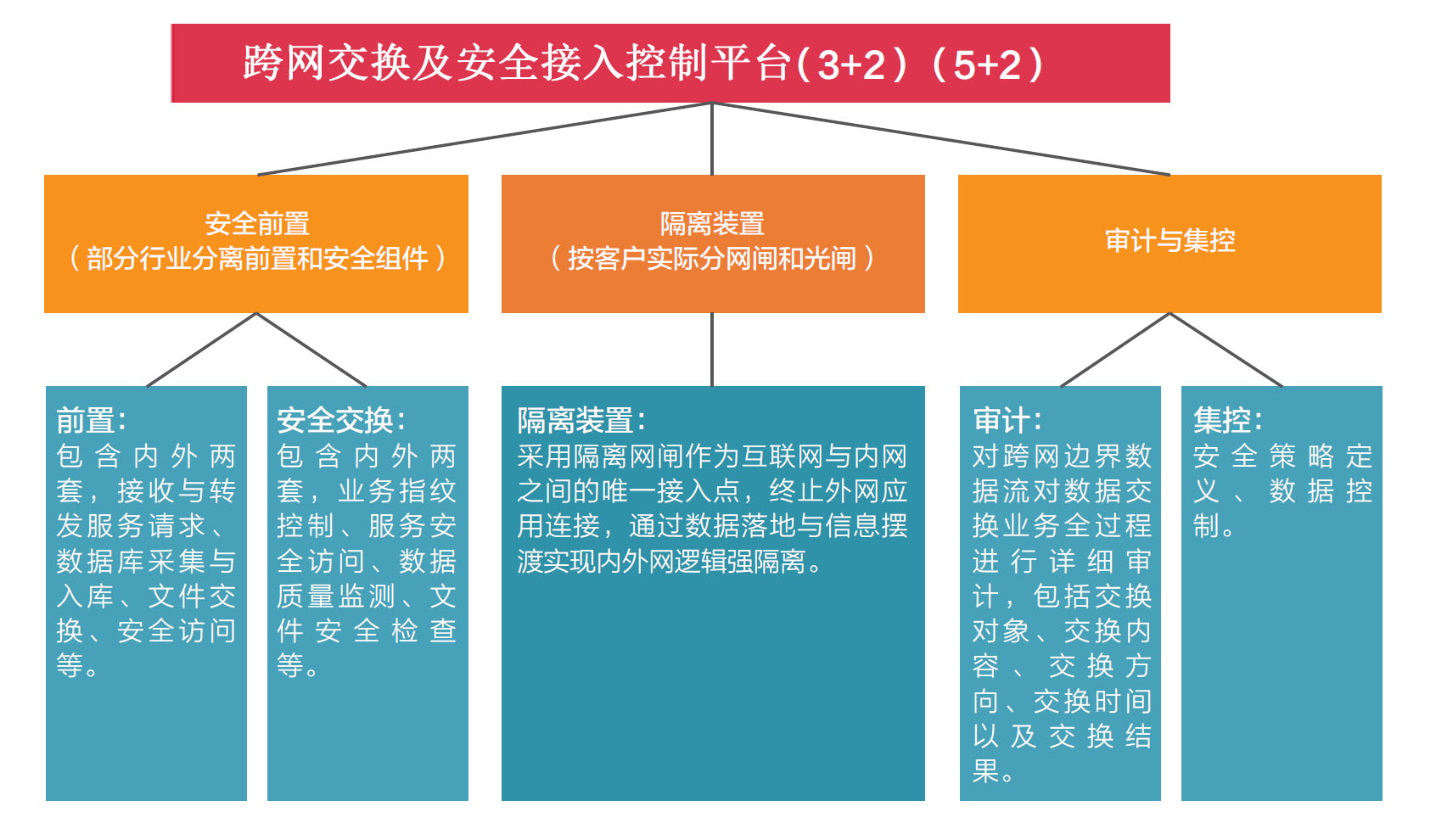 该方案是借鉴了公安行业三大接入平台(数据、视频、移动)最佳实践,结合《移动政务信息安全建设实施指南》、《国家电子政务外网跨区域安全数据交换技术要求与实施指南》、《信息安全技术网络和终端设备隔离部件安全技术要求》的要求,在传统网络安全措施的基础上,实现两网不同业务跨网交互过程中对数据的读取、服务的调用参数校验和控制、文件的交互、数据库的交互进行安全防控,共同形成一套完整的立体防护跨网安全数据交换平台。
