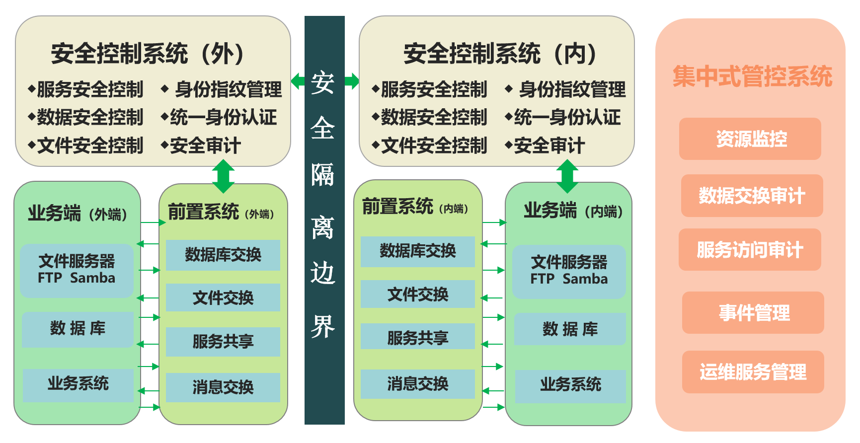 (4) 安全交换系统(内端):实现内端身份、认证的统一管理,并对数据交换、服务访问、文件交换过程进行安全审计。