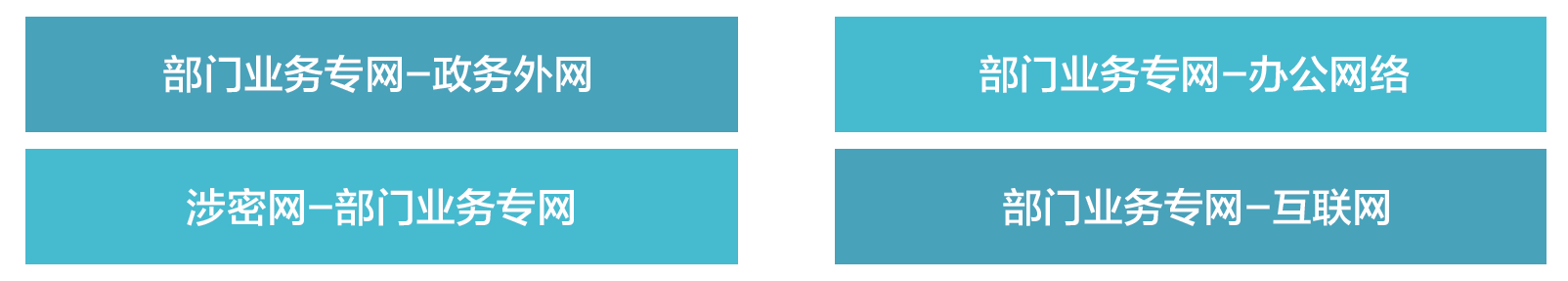 由于采用跨网安全交换平台防护的安全级别高,因此,尤其是与部门核心业务系统直接数据交互的几套网络间适合采用(对低安全边界,如办公网与互联网间,非核心业务系统网络边界间不建议采用),使用场景总结如下: