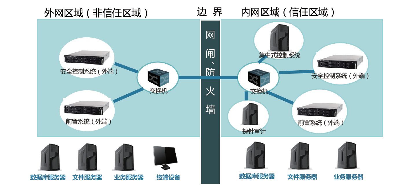 (3) 安全交换系统(外端):实现外端身份、认证的统一管理,并对数据交换、服务访问、文件交换过程进行安全审计。